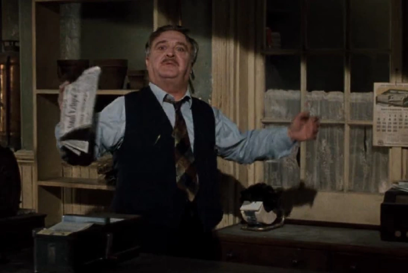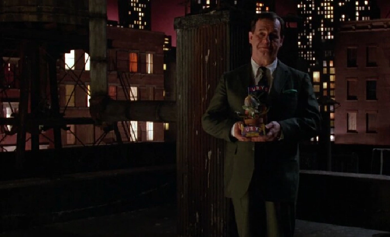 Mr. Mushkin yells at some black kids (portrayed by full-grown adults) who are loitering outside of his business, which doesn’t do much to clear the “ugly racial stereotypes” taste out of one’s mouth.