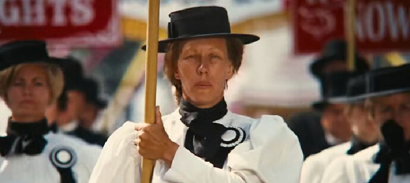 the movie takes a beat to make the joke that suffragettes were grim and stern and horse-faced, which, uh, great.