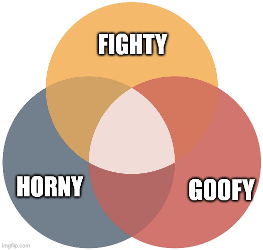 That covers “fighty” and “goofy”, as for “horny” - well,
