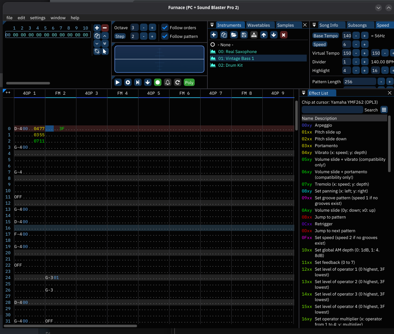 Also, I need some instruments? The Yamaha YMF262 is pretty late in the “sound chip cycle”, so it’s a powerful chip that has loads of parallel FM Synth channels, and it’s all FM synth in there. If I want to do anything I’m going to need to make some instruments.