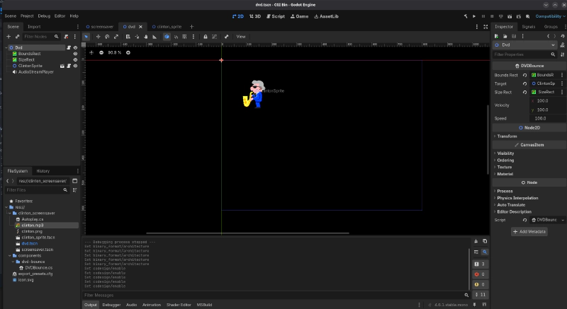 I checked the compiled size of BCLINTN_SCRN.exe and it’s 181.5 Megabytes. If you’re wondering what’s taking up all that space? It’s 3.7kB of pixel art, 908kB of sweet mp3, and then 180.55 additional megabytes of Godot Game Engine.